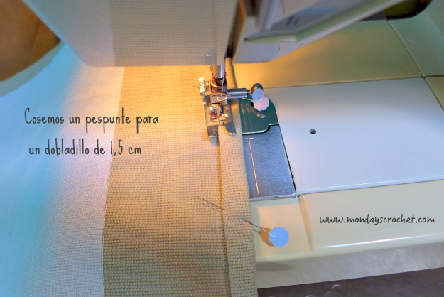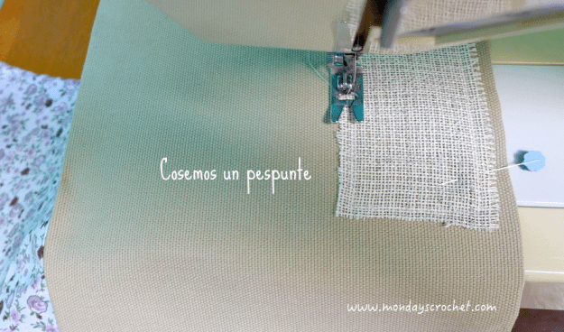Con hilo de color beige cosemos en la máquina un pespunte alrededor de la tela de algodón. Dejaremos 1 cm para hacerle un efecto deshilachado.