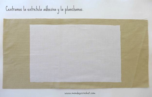 Para reforzar la tela de loneta camel en la zona donde se colocará el cuaderno, vamos a centrar la entre-tela adhesiva de 33 cm de ancho x 21 cm de alto y la planchamos sin aplicar vapor.