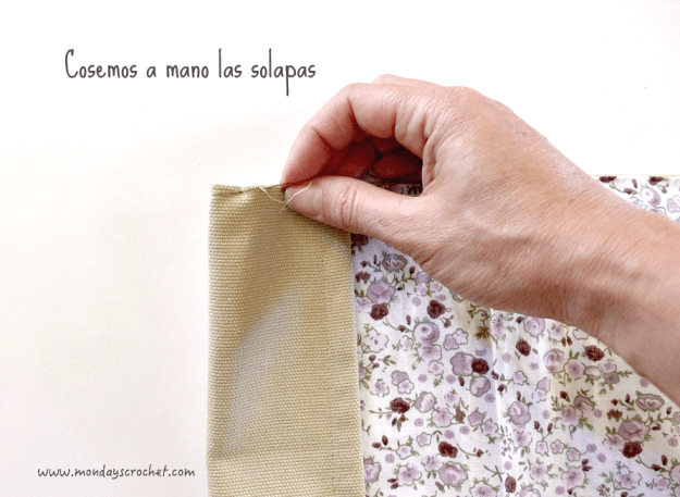 Dejamos el lado inferior sin terminar hasta que cosamos los adornos de la funda.