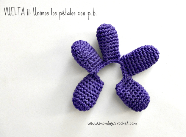 VUELTA 11: Con p.b. unimos los dos lados de cada pétalo y los cerramos. En total 25 p.b. en los 5 pétalos. A continuación tejemos 5 c.a.d. y cerramos con 1 p.c. en el primer pétalo.