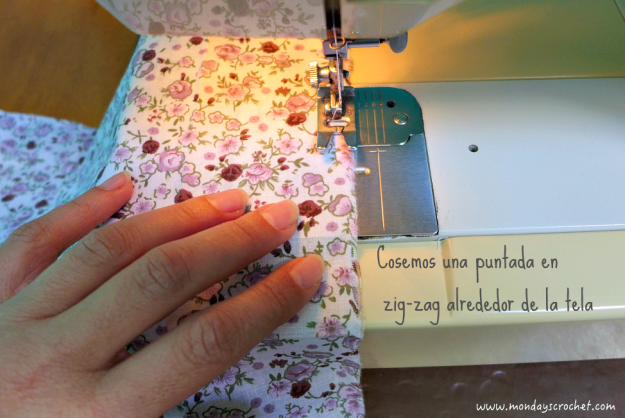 Con hilo de color blanco, cosemos en la máquina una puntada en zig-zag alrededor de toda la tela estampada.