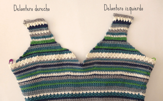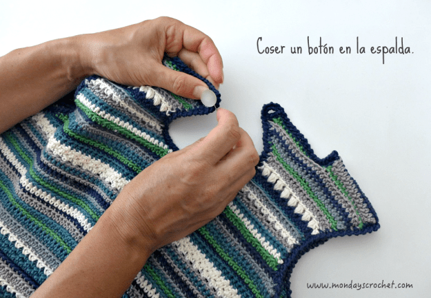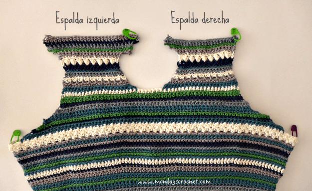 Separamos la espalda en 2 partes, dejando sin tejer 6 puntos en la parte central para formar una gota de agua unida con un botón.