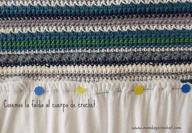 Fruncimos la tela con una puntada grande a mano, la prendemos con alfileres y la ajustamos a la medida del cuerpo tejido del vestido.