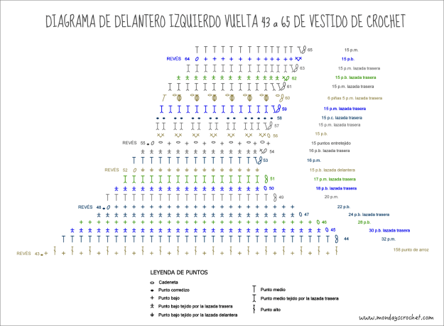 Contamos 33 puntos a partir del cuello de la VUELTA 43 y comenzamos a tejer el delantero izquierdo siguiendo el diagrama:Con color agua marina.