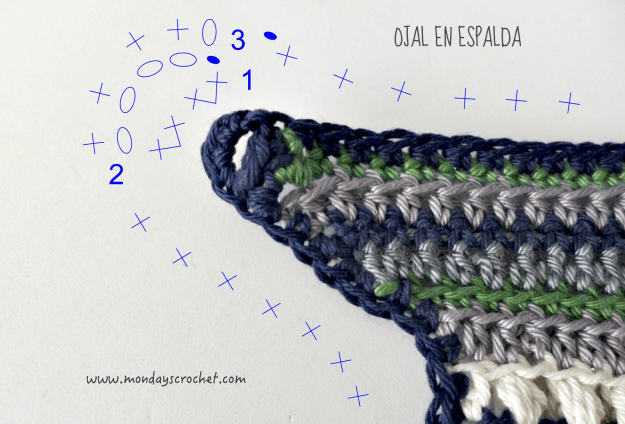 Para formar un ojal tejemos en el extremo de la VUELTA 66 de la espalda derecha y siguiendo el diagrama:Con color azul marino.