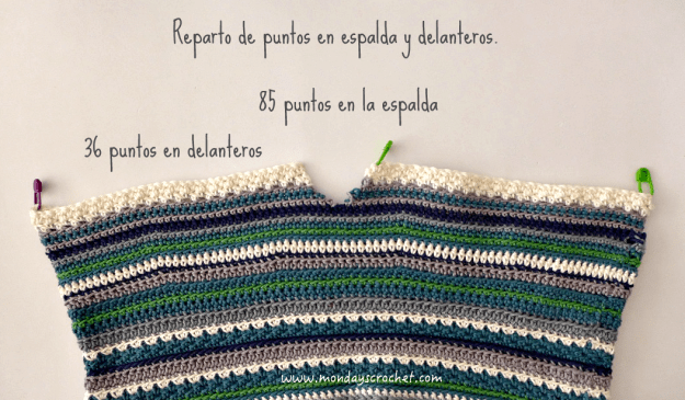 Desde el delantero derecho dejamos 9 puntos sin tejer para comenzar la espalda. Siguiendo este diagrama:Con color agua marina.