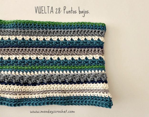 VUELTA 16 DERECHO: Tejemos 1 c.a.d. de subida que cuenta como 1 p.b., 2 p.b. juntos en la c.a.d. de la vuelta anterior hasta completar el contorno. En total 140 puntos. Cerramos con 1 p.b y 1 p.c. en la c.a.d. de subida y cambiamos de color.