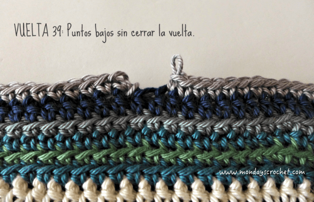 VUELTA 36 DERECHO: Tejemos 1 c.a.d. de subida que cuenta como 1 p.b. y 1 p.b. tejido por la lazada trasera, 163 p.b. tejidos por  la lazada trasera. En total 165 p.b. Cerramos con 1 p.c. en la c.a.d. de subida y cambiamos de color.