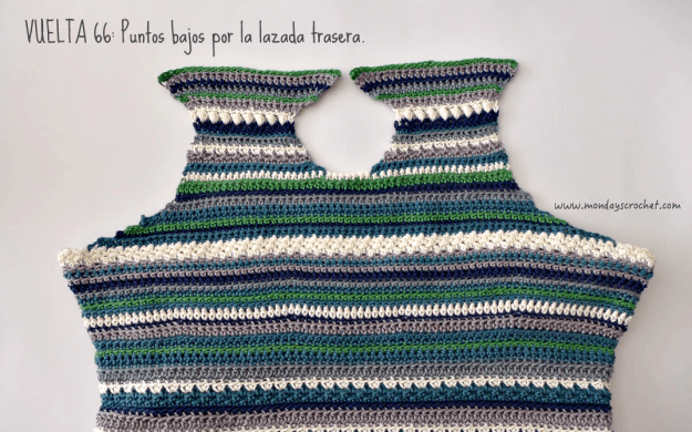 VUELTA 66 DERECHO: Tejemos 1 c.a.d. de subida que cuenta como 1 p.b. y 1 p.b. tejido por la lazada trasera, 26 p.b. tejidos por  la lazada trasera, 1 aumento 2 p.b. por la lazada trasera. En total 30 p.b. tejidos por la lazada trasera.Hemos terminado todas las partes del vestido. Rematamos con la aguja y cortamos con las tijeras el hilo sobrante.