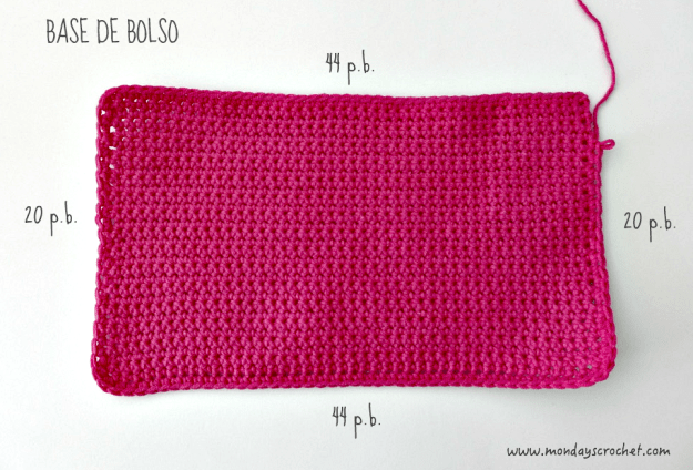Sin cortar el hilo tejemos p.b. alrededor de la base: 20 p.b. en los lados menores y 44 en los lados mayores. Cerramos con 1 p.c. en el primer p.b.
