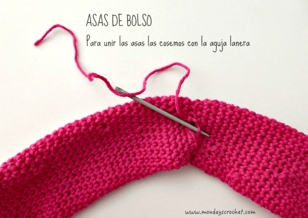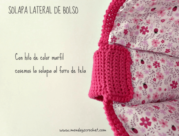 En la parte interior del bolso tejemos unas solapas de las asas para unir la tela interior del bolso.
