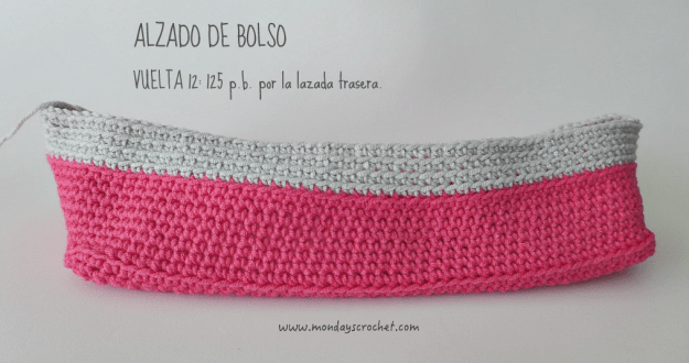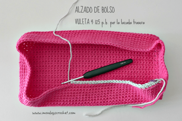 VUELTAS 9 a 12: Tejemos 1 c.a.d. de subida y 1 p.b. por la lazada trasera. Seguimos con 124 p.b. por la lazada trasera. En total 125 p.b. por la lazada trasera. Cerramos con 1 p.c.