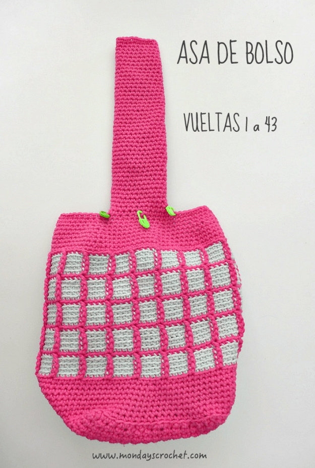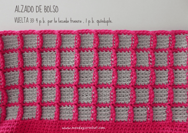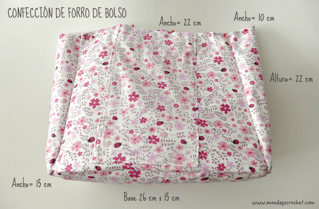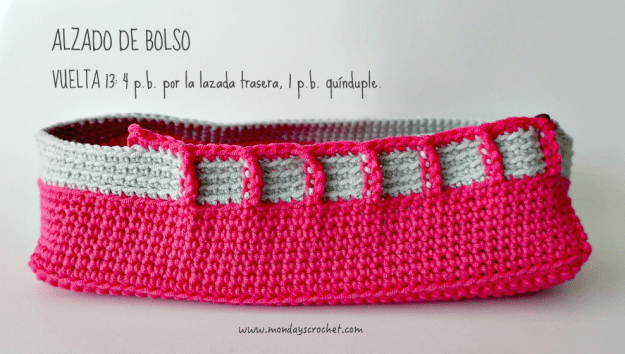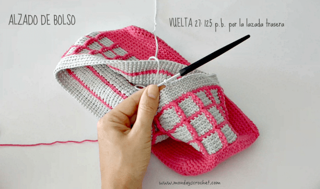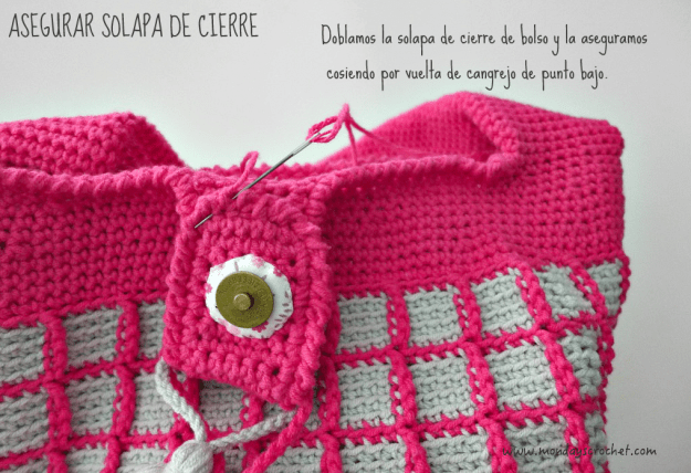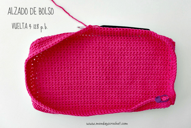 En la parte interior del bolso tejemos unas solapas de las asas para unir la tela interior del bolso.