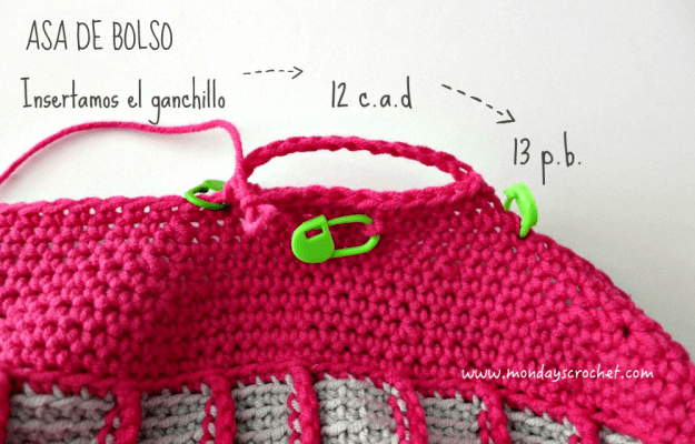 Insertamos el ganchillo en la primera c.a.d. de las 12 c.a.d. del asa.