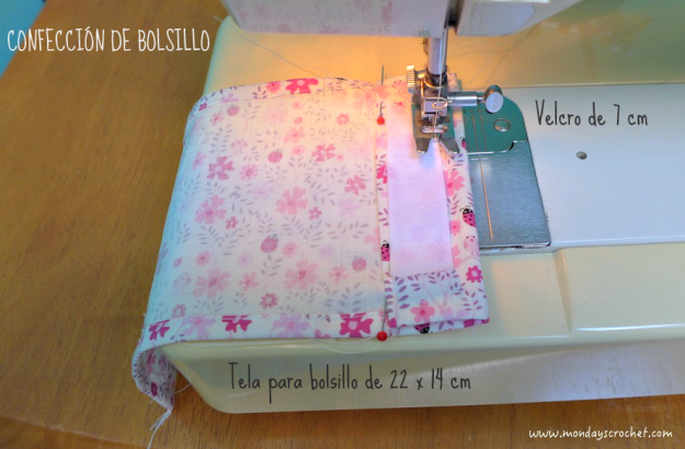 Centramos y cosemos el bolsillo en el lado que más nos guste. Pegamos la otra parte del velcro y la cosemos en la máquina a la tela estampada.Damos la vuelta al forro del bolso.