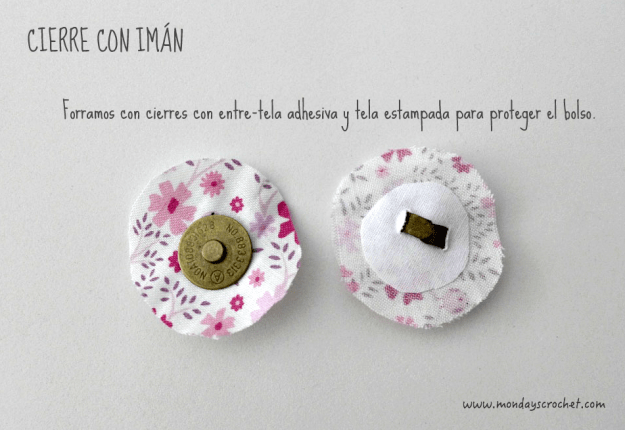 Para proteger el bolso del cierre con imán cortamos 2 círculos de 2,5 cm de tela adhesiva a 2 círculos de 4 cm de tela estampada, pegamos con la plancha las telas y hacemos 2 pequeños cortes con las tijeras para introducir cada parte del imán.Prendemos con alfileres las 2 partes del imán al bolso: una centrada en el bolso y la otra en la solapa. Y las cosemos con hilo de color marfil.