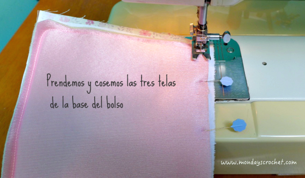 Ahora unimos la base a los lados mayores del alzado. La prendemos con alfileres y la cosemos en la máquina.