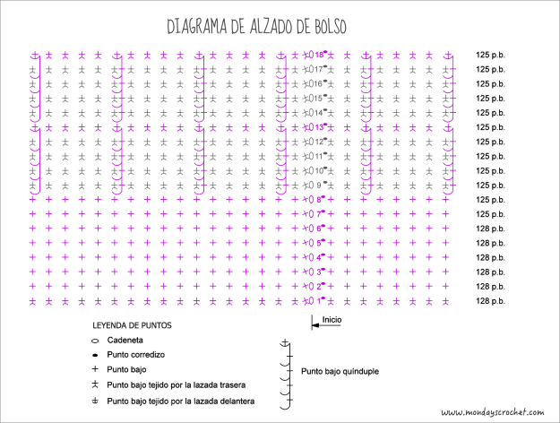 Tejemos el alzado del bolso en forma circular para que todas las vueltas queden por el derecho. Siguiendo el diagrama:VUELTA 1: Tejemos 1 c.a.d. de subida y 1 p.b. por la lazada trasera de los puntos de la base. Seguimos con 127 p.b. por la lazada trasera. En total 128 p.b. por la lazada trasera. Cerramos con 1 p.c. en la c.a.d. de subida.