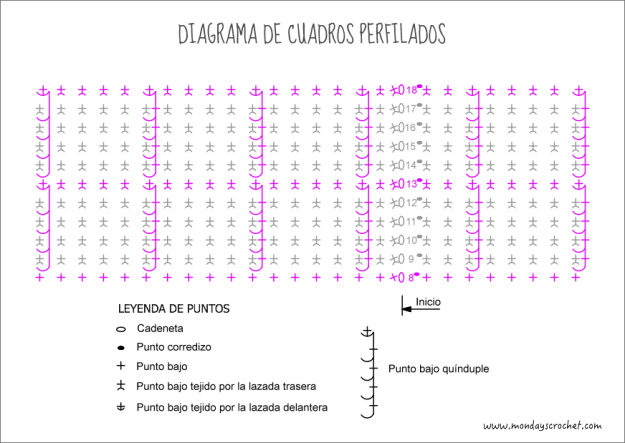 VUELTA 2 a 7: Tejemos 1 c.a.d. de subida y 1 p.b. en el primer p.b. de la vuelta anterior. Seguimos con 127 p.b. En total 128 p.b. Cerramos con 1 p.c.Para realizar punto de cuadros perfilados necesitamos múltiplos de 5 puntos. Debemos disminuir 3 puntos en la siguiente vuelta.