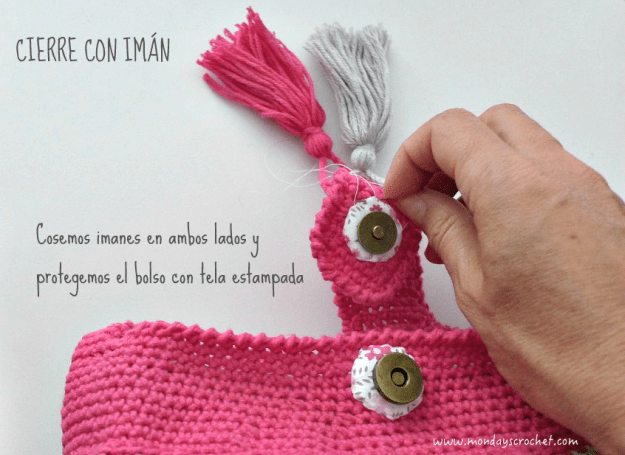 Por último, introducimos las borlas dentro de la solapa, la doblamos y cosemos a mano con hilo de color rosa fucsia entre las 2 vueltas de la terminación.Contadnos los colores que habéis empleado en vuestro bolso.