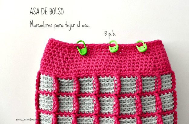 Para comenzar el ASA DERECHO ponemos 1 marcador después de la última vuelta del ALZADO.  Contamos 6 p.b. y marcamos el centro del asa. Contamos 6 p.b. marcamos el final del asa.