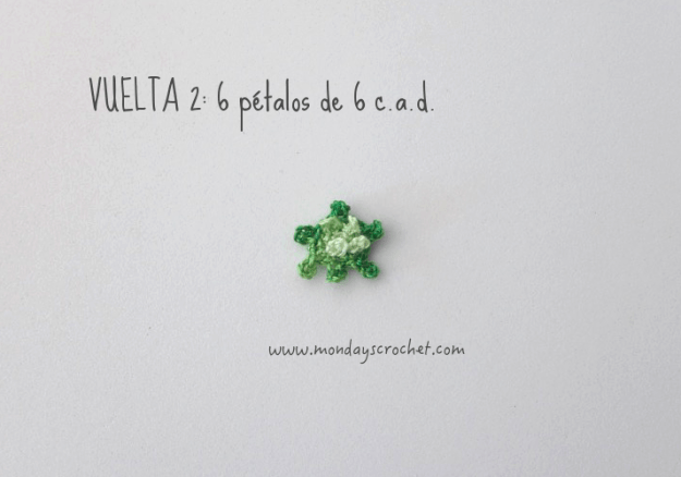 VUELTA 2: Tejemos 1 c.a.d. de subida y 1 p.b. en el p.b. de la vuelta anterior, 6 c.a.d, 1 p.c. en la primera c.a.d. para cerrar el primer pétalo, 1 c.a.d. de separación. Repetimos *1 p.b. detrás del primer pétalo de la vuelta anterior, 6 c.a.d, 1 p.c. en la primera c.a.d. para cerrar el pétalo y 1 c.a.d. de separación* 2 veces más. Continuamos con 1 p.b. entre los pétalos 2 y 3 de la vuelta anterior, 6 c.a.d, 1 p.c. en la primera c.a.d. para cerrar el pétalo y 1 c.a.d. de separación. Repetimos *1 p.b. detrás del tercer pétalo de la vuelta anterior, 6 c.a.d, 1 p.c. en la primera c.a.d. para cerrar el pétalo y 1 c.a.d. de separación* 2 veces más. Cerramos con 1 p.c. En total 6 pétalos de 6 c.a.d.