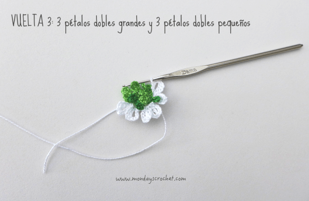 VUELTA 3: Tejemos 4 c.a.d. de subida, 1 p.a.d., 4 c.a.d. de bajada y 1 p.c. Repetimos 4 c.a.d. de subida, 1 p.a.d., 4 c.a.d. de bajada y 1 p.c. Hemos tejido los 2 primeros pétalos grandes. Pasamos al siguiente espacio entre pétalos de la vuelta anterior con 1 c.a.d. de separación. Repetimos *1 p.c., 4 c.a.d. de subida, 1 p.a.d., 4 c.a.d. de bajada, 1 p.c., 4 c.a.d. de subida, 1 p.a.d., 4 c.a.d. de bajada, 1 p.c. y 1 c.a.d. de separación* 2 veces más. Hemos tejido 3 grupos de pétalos grandes.  A continuación hacemos 3 grupos de pétalos pequeños. Tejemos 1 p.c., 5 c.a.d., 1 p.c., 5 c.a.d., 1 p.c. y 1 c.a.d. de separación. Repetimos *1 p.c., 5 c.a.d., 1 p.c., 5 c.a.d., 1 p.c., 1 c.a.d. de separación* 2 veces más. Terminamos con 1 p.c. En total 3 grupos de pétalos grandes y 3 grupos de pétalos pequeños.